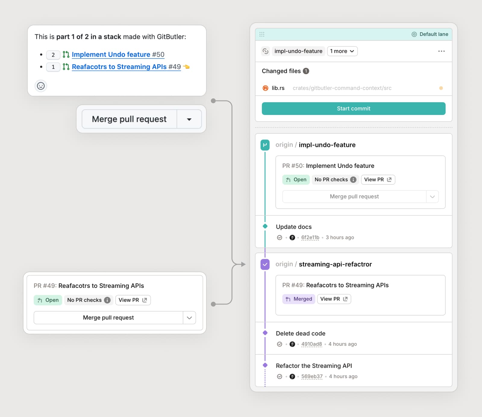 In fact GitButler implements stacked branches as Virtual Branches that are split into multiple dependent branches.